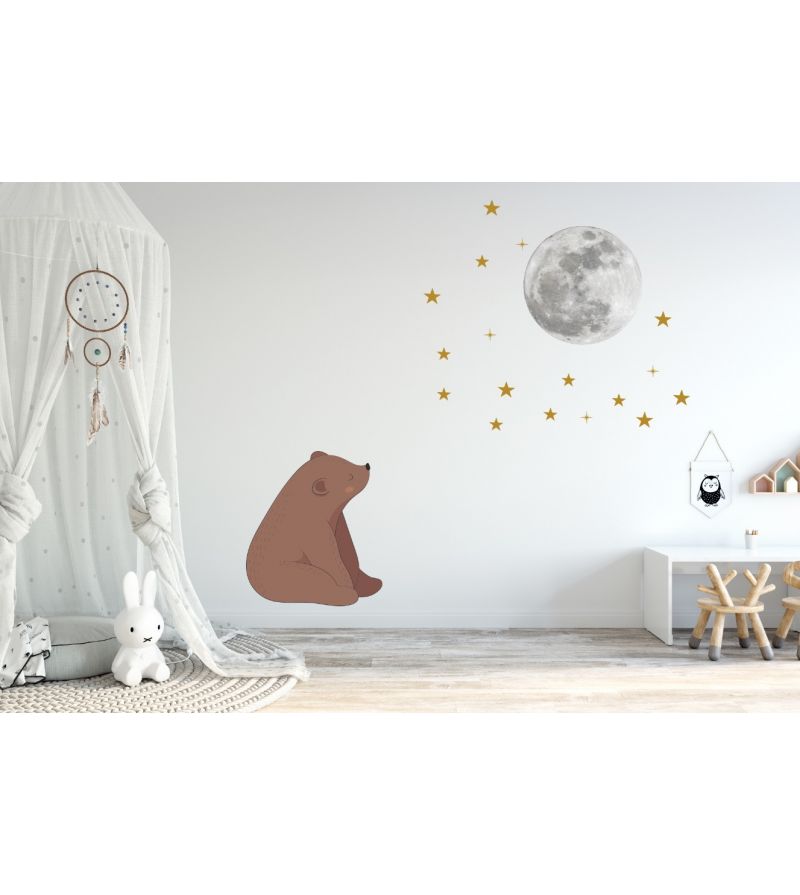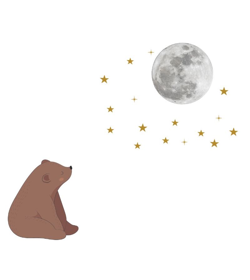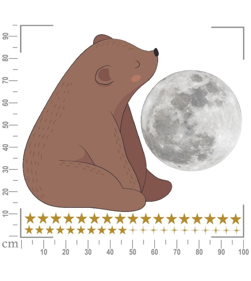 - ROZMIARY: niedźwiadka: 68cm (szerokość) x 80cm (wysokość); księżyc: 45cm; złote metaliczne gwiazdki 38szt: 4-5cm