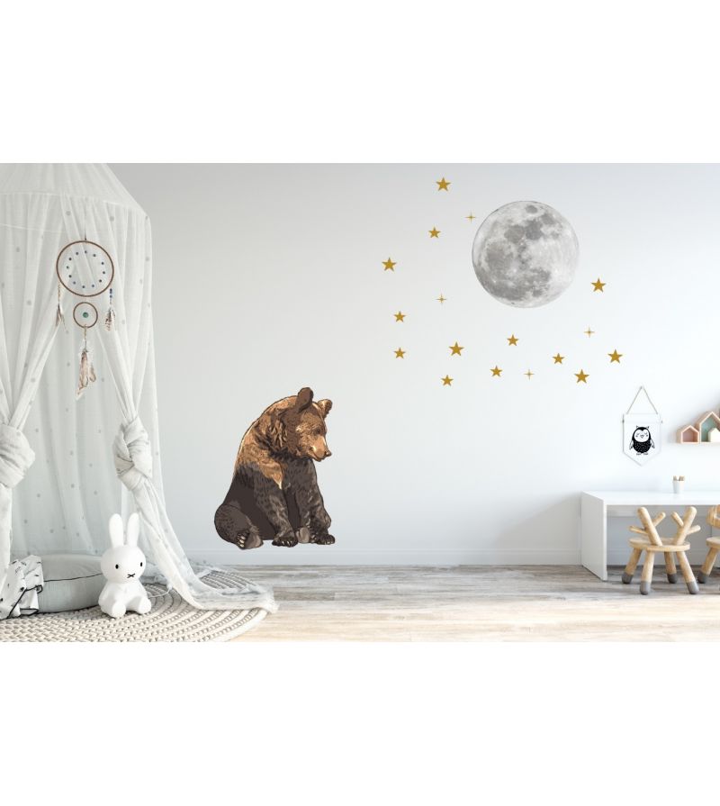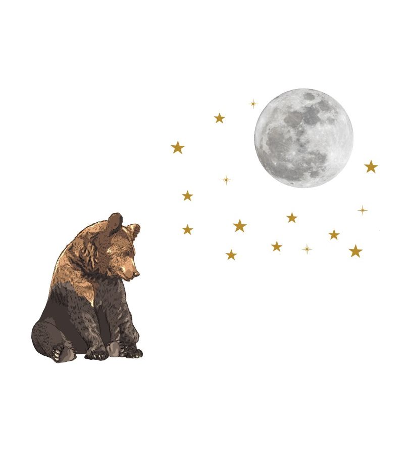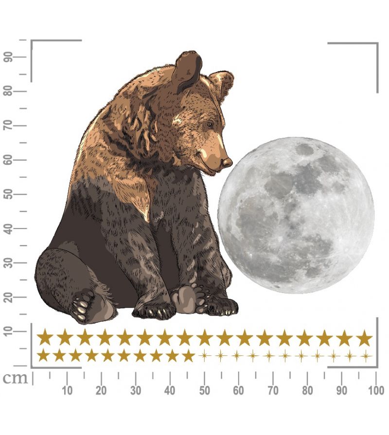 - ROZMIARY: niedźwiadka: 60cm (szerokość) x 80cm (wysokość); księżyc: 45cm; złote metaliczne gwiazdki 38szt: 4-5cm