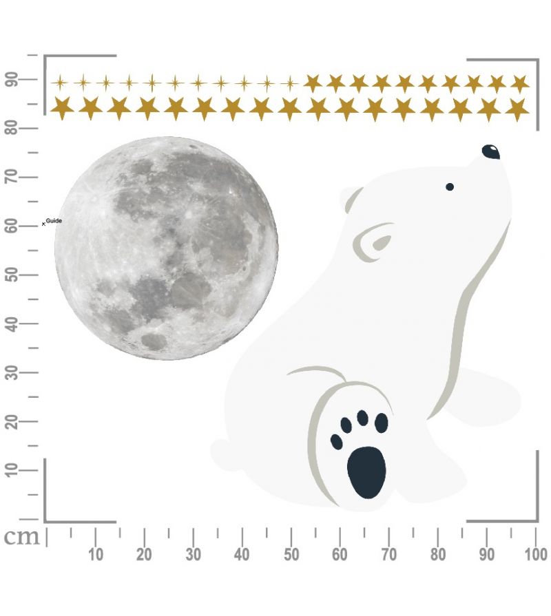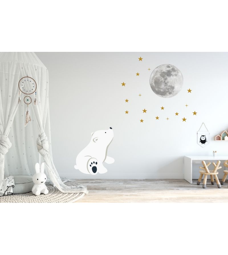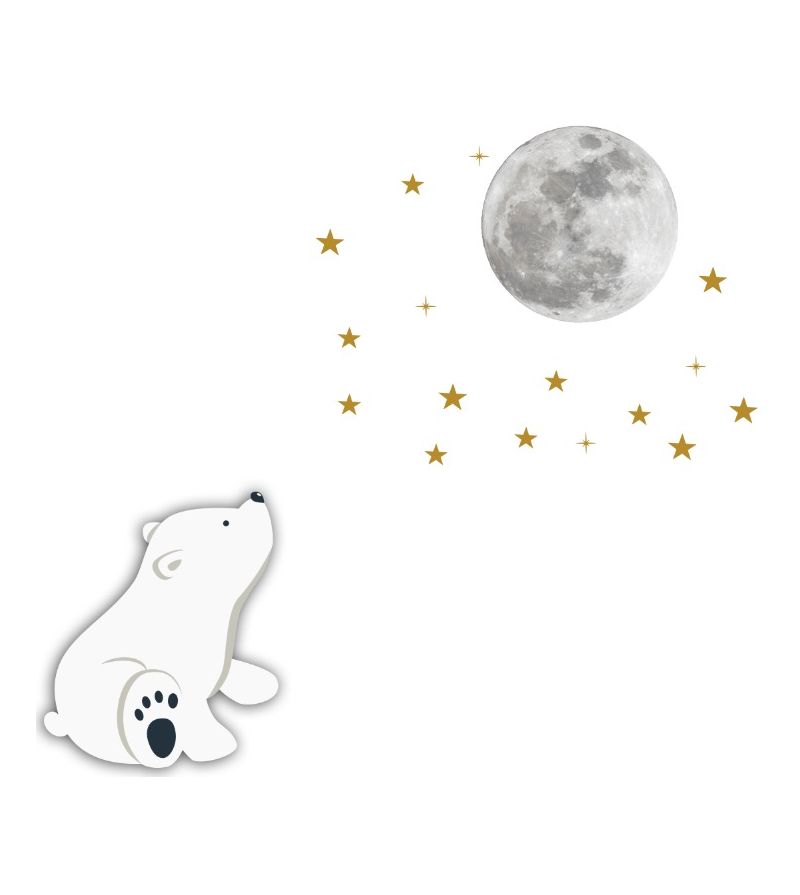 - ROZMIARY: niedźwiadka: 63cm (szerokość) x 75cm (wysokość); księżyc: 45cm; złote metaliczne gwiazdki 38szt: 4-5cm