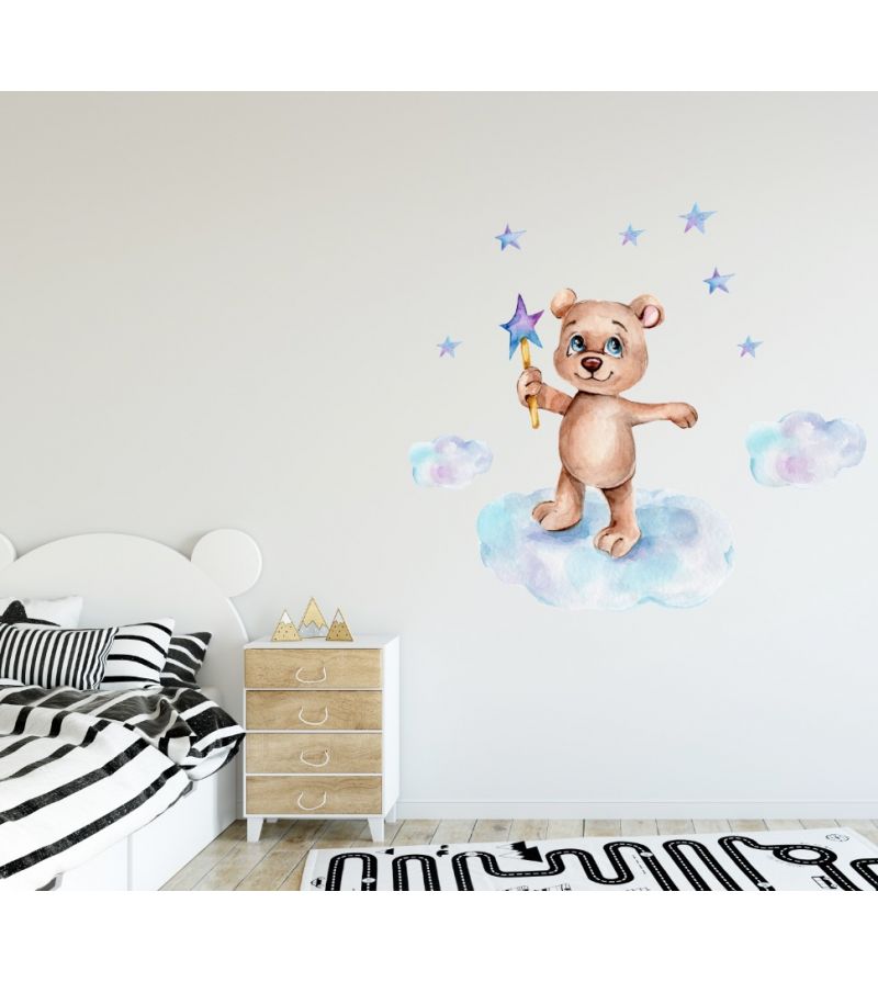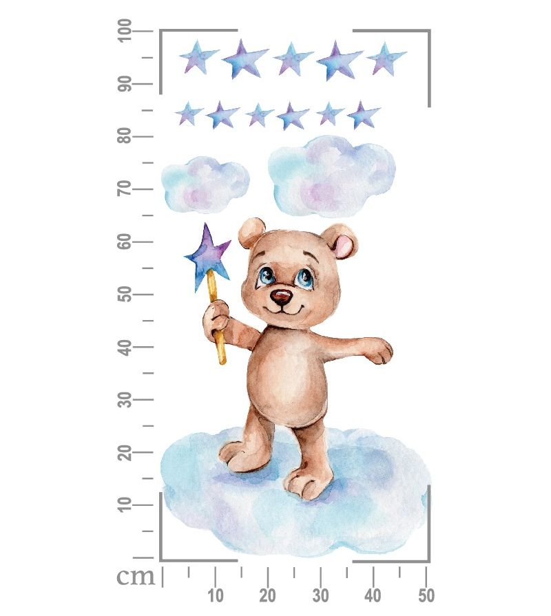 - całkowity rozmiar misia na chmurce: 52cm (szerokość) x 65cm (wysokość). W komplecie 2szt churek oraz 11szt gwiazdek.
